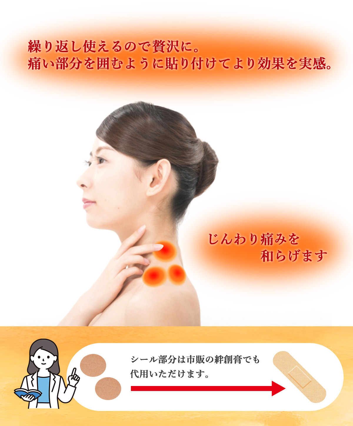 ※ 販売するのは粒状の形状をしたものになります。 ※ 繰り返し使えるので贅沢に。 ※ 痛い部分を囲むよう貼り付けて、より好感を実感。 ※ シール部分は市販の絆創膏でも代用いただけます。